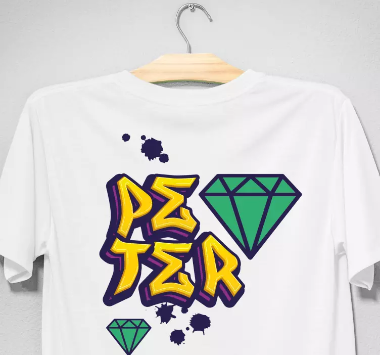 这个生动的设计展示了名称 'Peter' 以粗体、风格化的字母形式,并搭配一个绿色的钻石图形。活泼的元素包括多彩的飞溅,增强了现代感。非常适合休闲穿着,它将独特的艺术风格与个人风格相结合。
