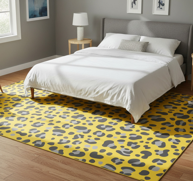 这幅图像具有生动的设计,背景是明亮的黄色,上面点缀着各种不同的灰色斑点。斑点的大小和形状各异,形成了一种动态的图案,令人联想到自然纹理。这种设计体现了一种既俏皮又时尚的美学,增强了视觉趣味。