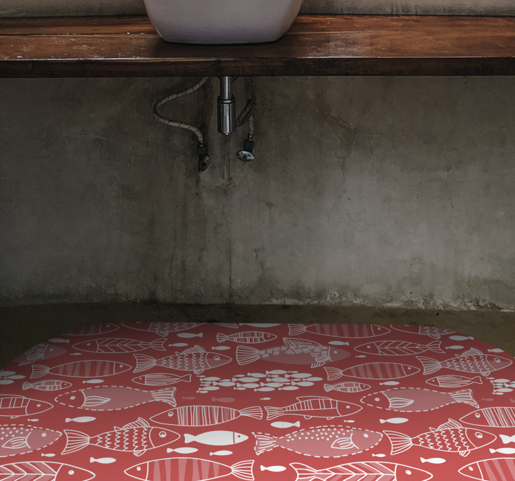 乙烯基地毯动物 鱼图案装饰拥有独特的设计,融合了海洋生活元素,包括鱼图案、海洋和水的红色和白色装饰,展现出一种充满活力和艺术感的程式化设计。