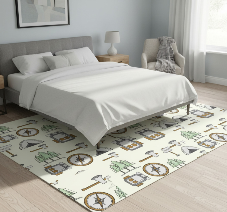 卧室乙烯基地毯,露营包碗、头灯、指南针