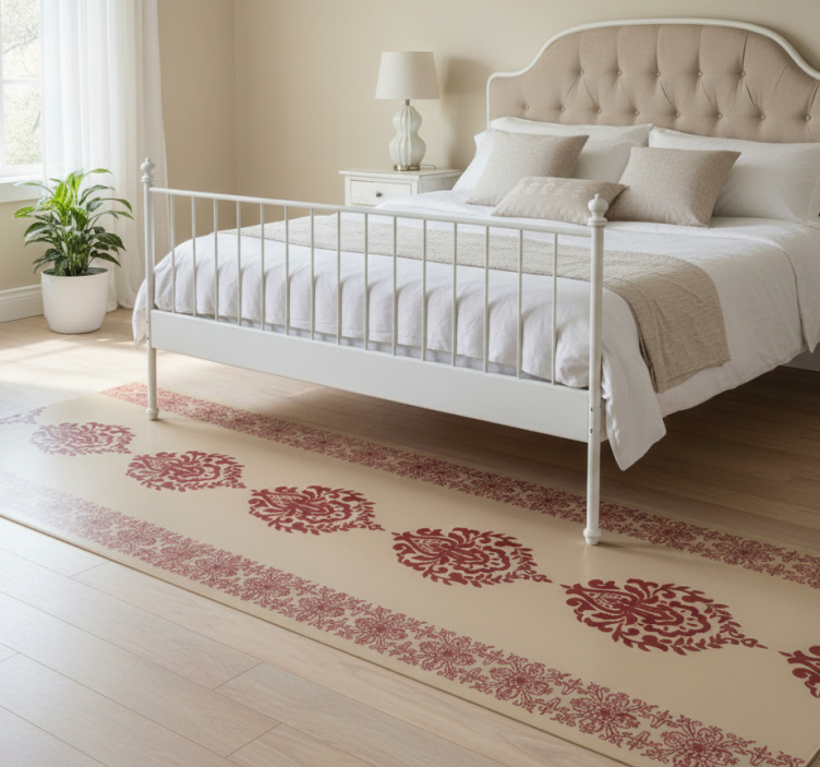 一个装饰性设计呈现出丰富的红色与柔和的米色背景之间复杂的图案。这些图案展示了花卉和华丽的细节,排列成对称的布局。每个元素都经过精心间隔,创造出一种协调而优雅的外观,引导视线沿着产品的长度移动。