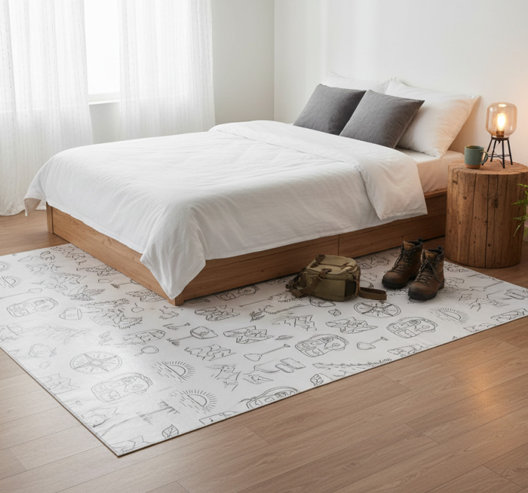 这幅图呈现出一个明亮的背景,上面装饰着各种细致的插图。设计中包含树木、山脉、指南针和地图等元素,搭配背包和露营主题。这些图案主要以黑色为主,与白色背景形成鲜明对比,增强了户外冒险的主题。