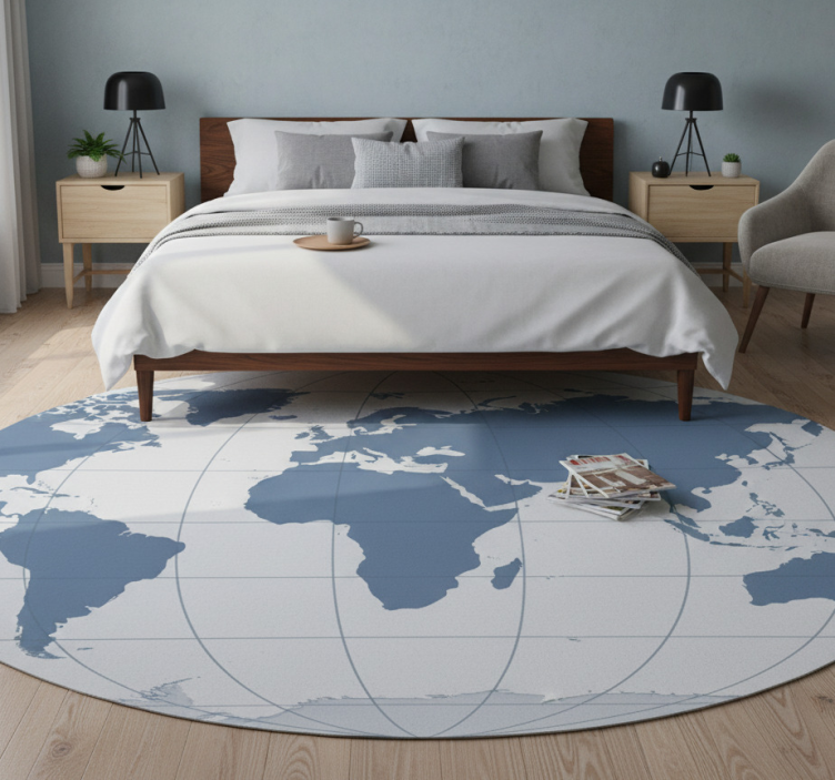 该设计展示了一幅详细的世界地图,主要使用蓝色和白色的色调。地图包含了各大洲和国家的轮廓,背景为浅色。圆形的设计增强了地球的外观,网格线表示纬度和经度,形成了一种既具有教育意义又富有艺术感的呈现。