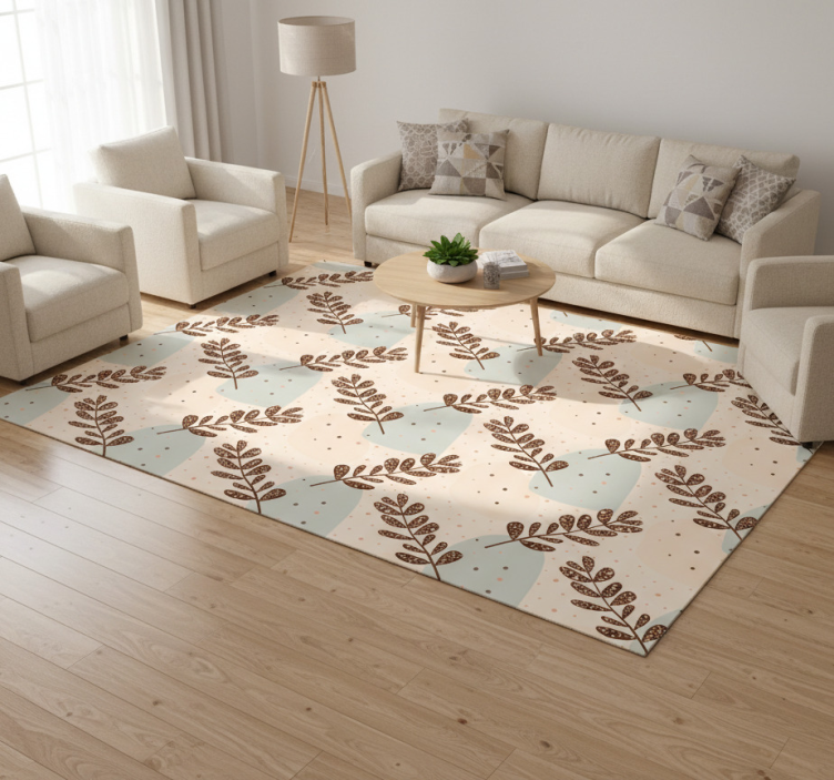 该设计采用了重复的风格化植物元素图案,具有细长的叶子和点状图案。这些元素置于一个柔和的背景上,背景结合了淡色和抽象形状。整体美感和谐,创造出一种在整个表面流动的视觉节奏。