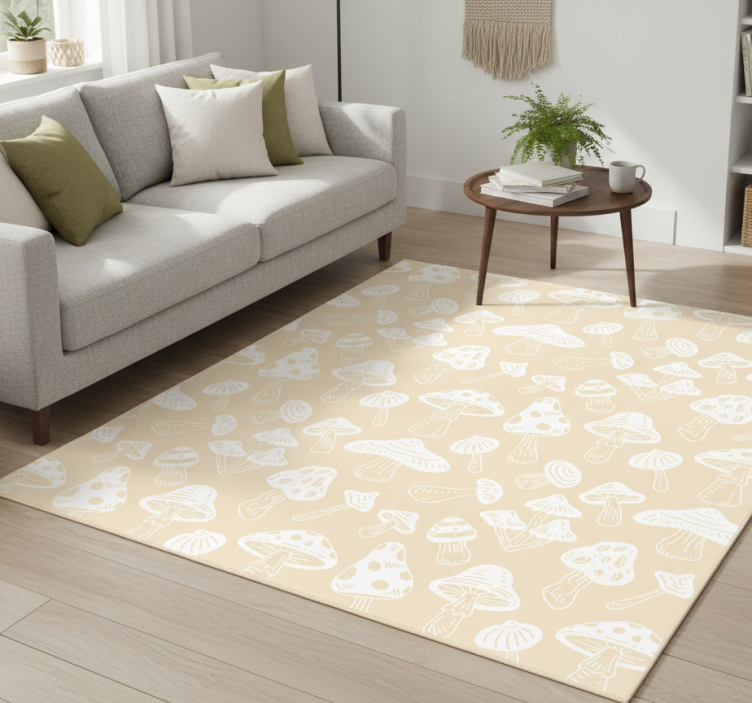 一个浅米色的表面,上面绘制着各种形状和大小的手绘白色蘑菇。设计中包含高大、宽大和小巧的蘑菇,展示了多样的风格,包括一些帽子上的斑点。整体效果既俏皮又和谐,在整个区域创造出活泼的视觉节奏。