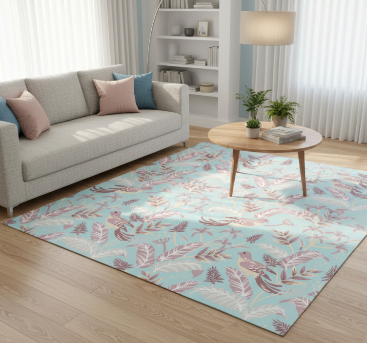 一个充满活力的设计,展现了在柔和的粉彩色调中,风格化的鸟儿与郁郁葱葱的叶子相映衬。背景是浅蓝色,配以复杂的叶子和花卉元素图案,色调为粉色和紫色。鸟儿显得优雅,整体构图散发出自然与宁静的感觉。
