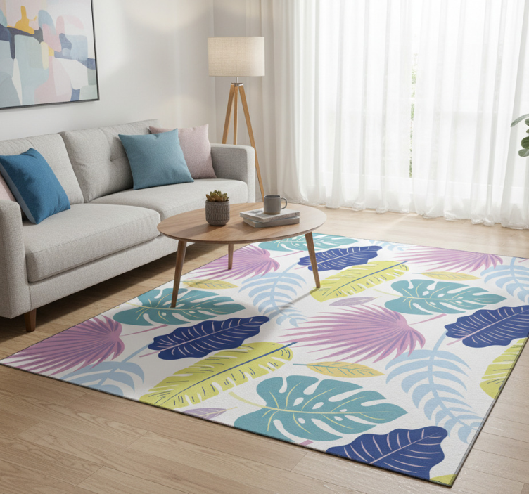 该设计展示了一系列生动的植物叶子,包含蓝色、绿色和紫色的大型热带叶子。精致的细节突显了叶子的纹理,形成了一个充满活力的图案,捕捉了自然的精髓。整体美感呈现出一种清新而活泼的氛围,非常适合为任何空间增添亮色。