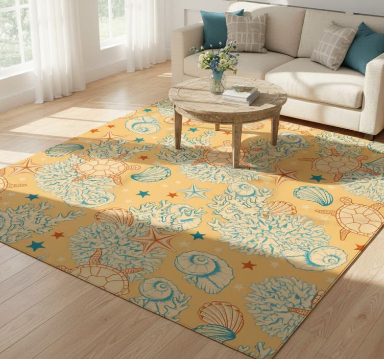 一个充满活力的设计展现了精美的海洋生物插图,包括海龟、海星和各种贝壳。背景是温暖的黄色,而海洋元素的细致轮廓则用青绿色和橙色突出。珊瑚形成的纹理为生动的图案增添了层次感,创造出一种视觉上动态的构图。