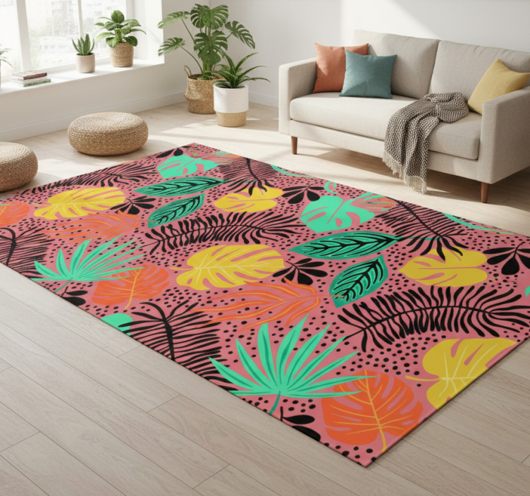 该设计展现了一组生动的热带叶子,色彩包括各种绿色、黄色和橙色,与活泼的粉色背景形成对比。黑色的装饰,包括细线和斑点图案,增添了深度,而整体构图则传递出一种动态而清新的美感。