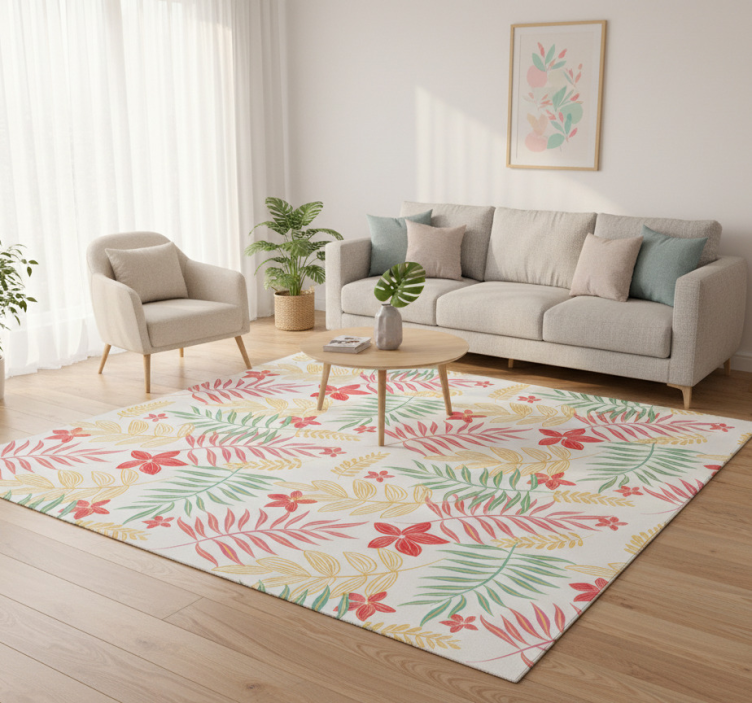 一个充满活力的设计,展示了一系列绿色叶子,并辅以红色和黄色的花朵。复杂的图案流畅地融合在一起,创造出一种生动自然的美感。背景为柔和的浅色调,突显了色彩丰富的元素,使设计呈现出清新而诱人的外观。