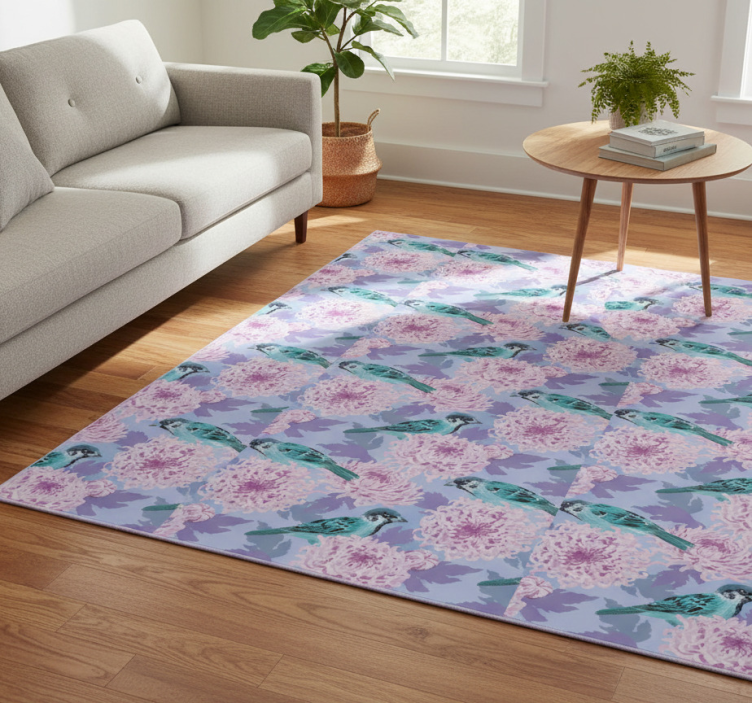 该设计展示了一种生动的图案,采用了青绿色调的风格化鸟类,背景为柔和的薰衣草色调。鸟类周围环绕着大型蓬松的花朵,呈现出细腻的粉色,创造出色彩和质感的和谐融合。整体美学活泼且视觉吸引人。