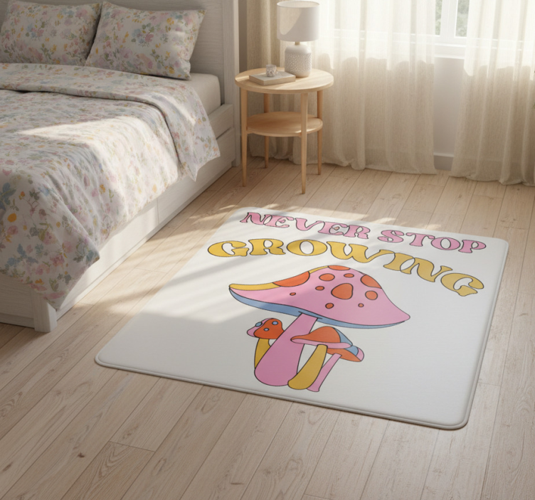 一个充满活力的设计展示了一朵大蘑菇,粉色的帽子上点缀着橙色的斑点,旁边还有几朵红色和蓝色的小蘑菇。在蘑菇上方,短语 'NEVER STOP GROWING' 显眼地展示出来,使用了粉色和黄色的俏皮字体,背景为白色。