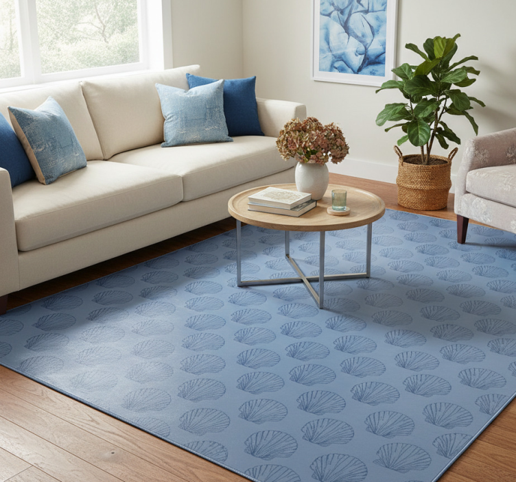 一种宁静的设计呈现出蓝色贝壳形状的重复图案,背景是柔和的浅蓝色。风格化的贝壳展现出细致的线条细节,营造出深度和质感。这种布局唤起了一种宁静的海岸主题,吸引那些寻求清新视觉美感的人。