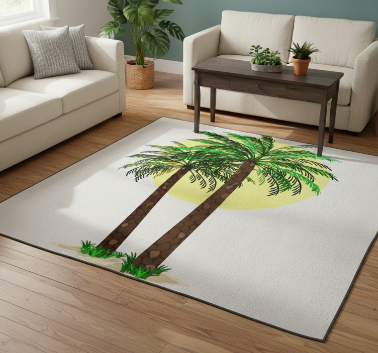 两棵高大的棕榈树,生机勃勃的绿色叶子在设计的中心显得格外显眼。它们的树干呈现出丰富的棕色纹理,给人一种粗犷自然的感觉。树后面是一个大型明亮的黄色圆圈,像太阳一样,为整个构图增添了温暖和热带气息。