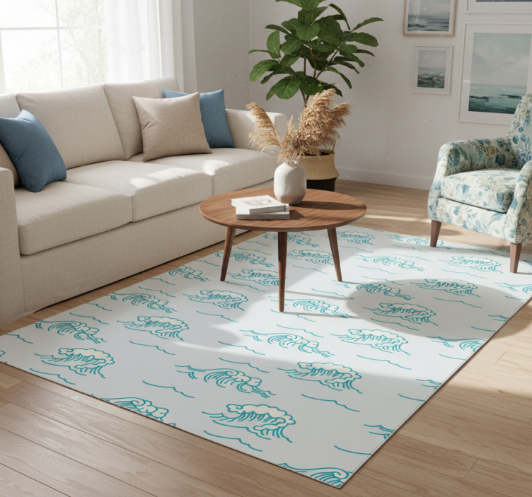 这幅图像展示了一个由生动的青绿色和白色波浪组成的重复图案。每个波浪都 intricately illustrated 以动态曲线和泡沫顶峰,传达出运动和流动的感觉。背景保持在柔和、低调的色调中,以增强波浪设计的鲜艳度。