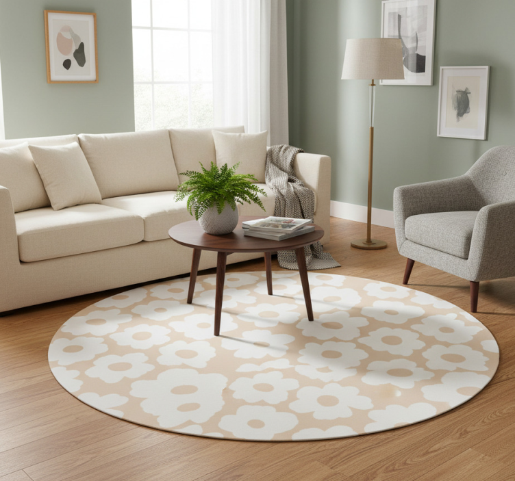 该设计呈现出一种重复的大型风格化白色花朵图案,背景为柔和的米色。花朵具有圆润的花瓣和中央开口,营造出一种既俏皮又和谐的外观。整体效果轻盈通透,适合各种装饰环境。