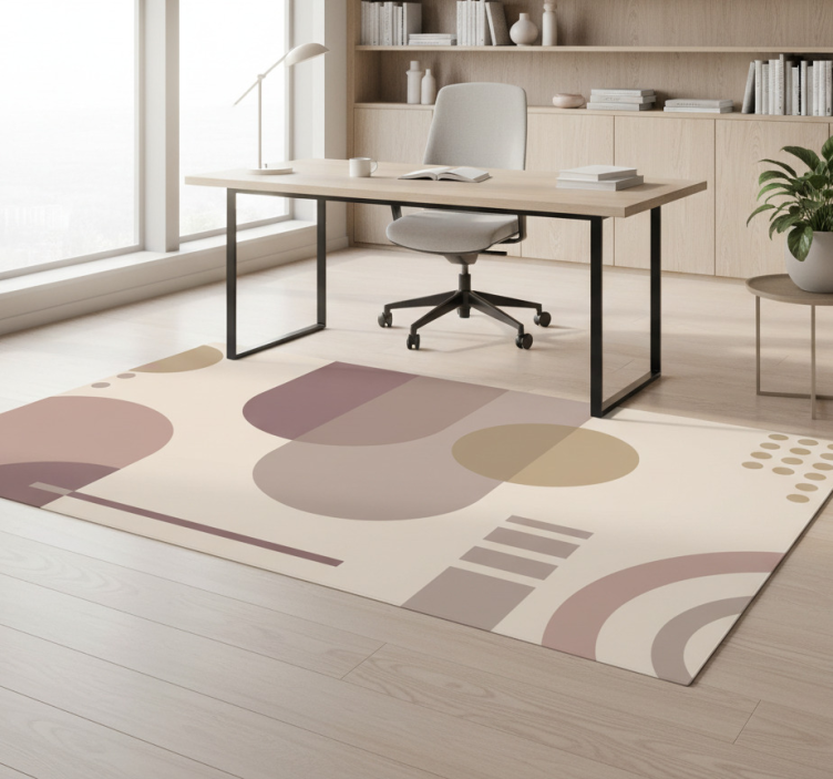 该设计呈现出各种几何形状,包括大圆、半圆和线性元素,所有这些元素都以和谐的布局排列。柔和的色调调色板,如柔粉色、棕色和米色,营造出宁静的效果,而不同的透明度则为整体构图增添了深度和纹理。