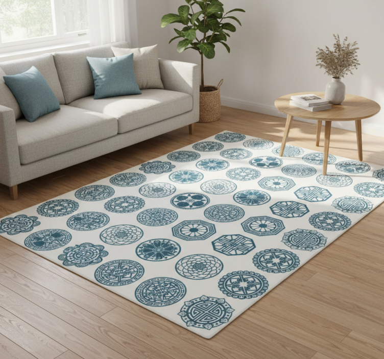 该设计采用了一系列不同图案和蓝色阴影的圆形图案,背景为浅色。每个圆形都融入了复杂的细节,包括花卉、几何和抽象风格,形成了一个和谐且视觉上引人入胜的整体。