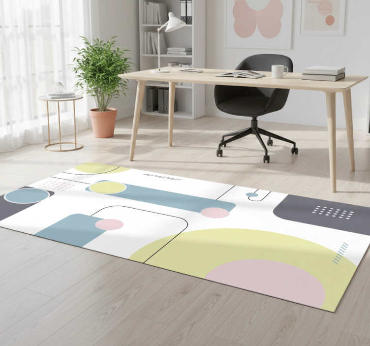 该设计呈现出一种抽象的构图,包含各种几何形状,如圆形、矩形和线条。柔和的粉色、浅黄色、蓝色和柔和的灰色等颜色构成了和谐的调色板。整体布局暗示出一种平衡的设计,既有清晰的区域,也有复杂的元素,强调了现代美学。