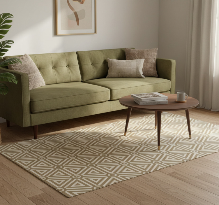 这幅图像展示了一种几何图案,由相互连接的三角形和圆形组成。设计采用了米色和浅棕色的中性色调,创造出一种有节奏的视觉流动。形状的排列是对称的,呈现出一种现代美学,吸引着观者的目光穿过表面。