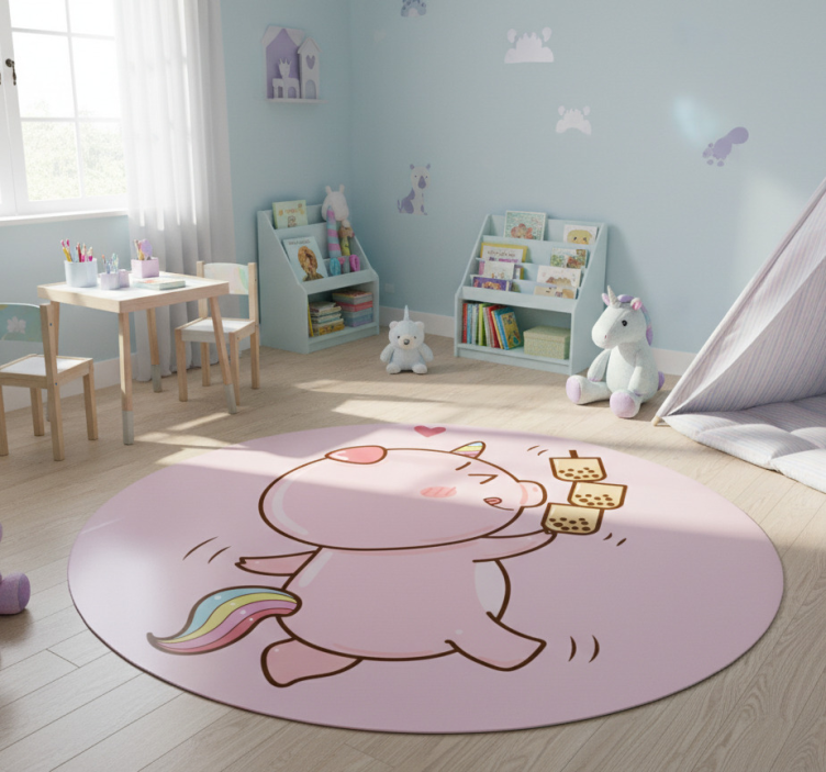 一个圆形的设计展示了一只快乐的粉色独角兽,拥有五彩缤纷的尾巴,愉快地拿着三杯冒泡的饮料。独角兽有一根小小的金色角,空中飘着心形图案,增添了它的俏皮外观。背景是柔和的色调,与生动的角色相得益彰。
