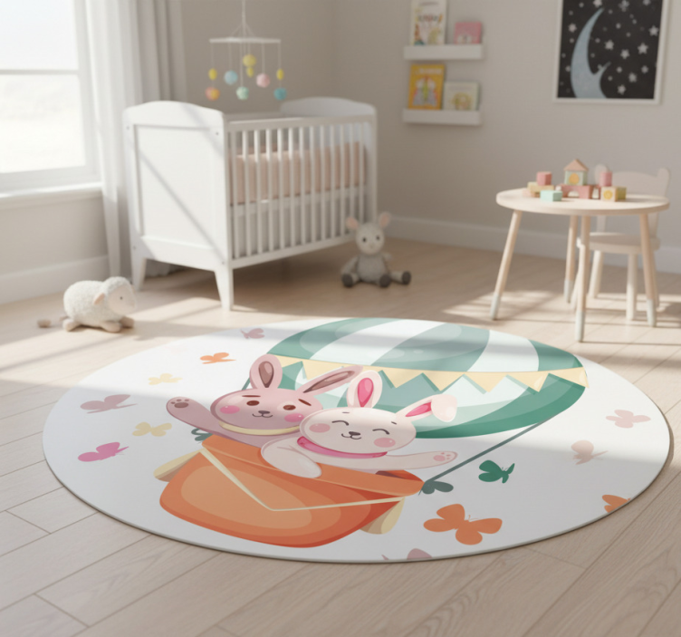 一个充满趣味的设计展示了两只快乐的兔子在一只色彩斑斓的热气球里。兔子们面带愉悦的表情,挥舞着它们的爪子。周围飞舞着五彩斑斓的蝴蝶,增添了一丝奇幻的气息。热气球上装饰着三角旗,突显了冒险和乐趣的生动主题。