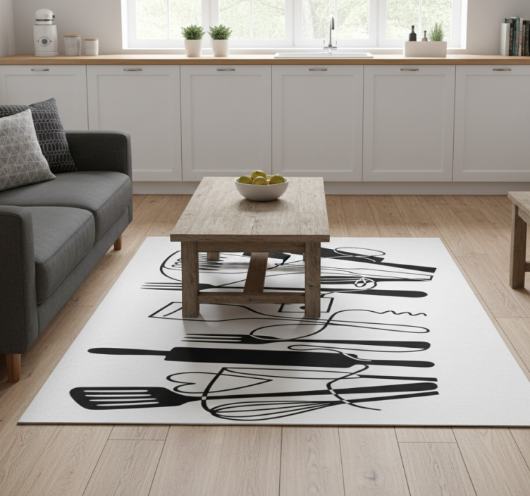 该设计展示了一系列厨房用具和工具,采用极简主义的单色风格。物品包括一个 rolling pin、叉子、铲子和一个 whisk,所有物品通过流畅的线条交织在一起,形成一种动态的视觉节奏。整体效果是对烹饪主题的俏皮而时尚的表现。