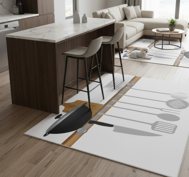 一个视觉上引人注目的设计展示了一组厨房用具,包括一把刀和一个铲子,整齐地排列在一个金属架上。一个黑色锅放在一个木质切菜板旁边,为主要以单色调为主的色彩方案增添了对比。背景突出了干净整洁的厨房美学。