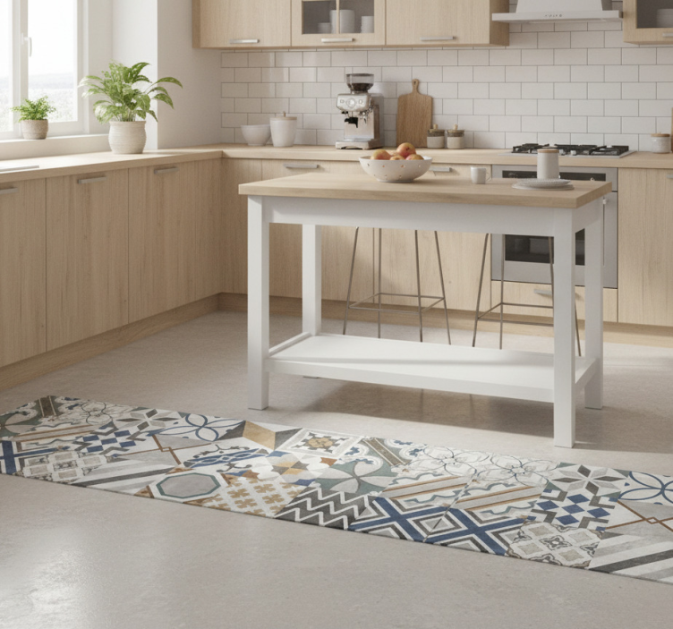 清洁kitchen vinyl rug非常简单!只需用湿布轻轻擦拭即可,保持乙烯基厨房地毯独特几何拼贴设计的美观与清洁,让您的厨房始终如新。
