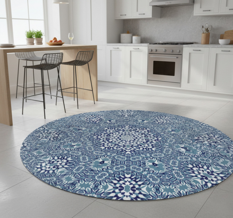 一个圆形设计,呈现出复杂的图案,以蓝色和白色为主色调。花卉图案与几何形状交织在一起,形成一个视觉上引人入胜的排列。整体的对称性散发出优雅,细致的元素从中心辐射开来,吸引人们的注意与欣赏其工艺。