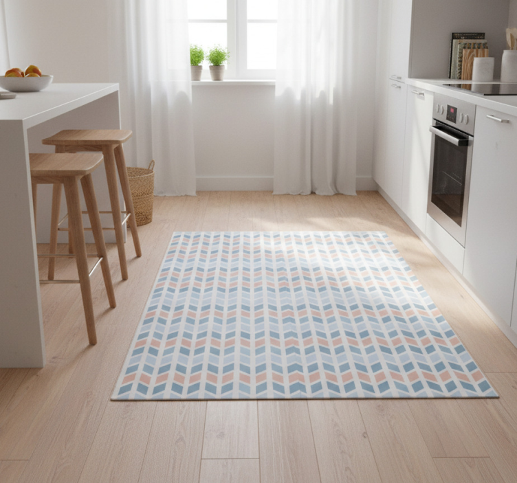 该设计呈现出一种重复的交错人字形图案,采用柔和的粉色、浅蓝色和白色。每个人字形由实色块组成,排列成垂直条纹,形成一种有节奏的视觉流动。整体效果和谐且引人注目。