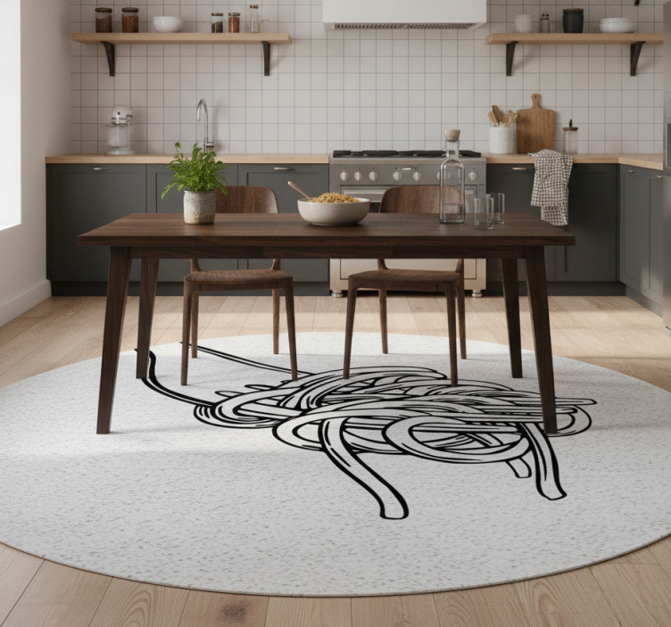 一个圆形地毯呈现出一种俏皮的设计,交织的线条像是一簇意大利面。背景是柔和、低调的色调,提供了微妙的对比,突出了黑色的图形绘画。复杂的线条工作创造出动态的视觉效果,吸引人们关注其独特的艺术性。