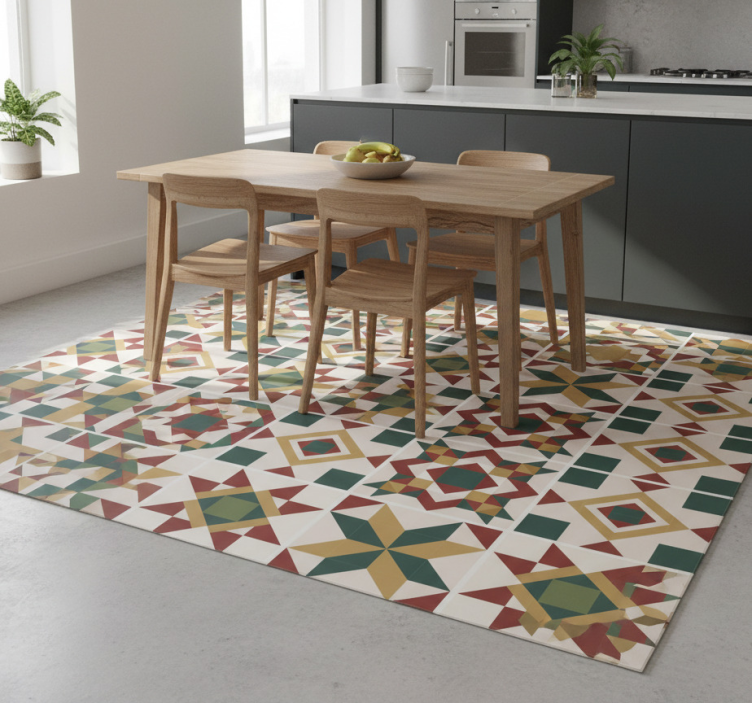 这幅图像呈现出一个充满活力的设计,由各种颜色的几何形状组成,包括深绿色、丰富的红色和温暖的黄色。复杂的图案相互交错,形成了钻石、星星和方形,背景为奶油色。这样的排列创造了一个动态的视觉节奏,吸引着目光在表面上游走。
