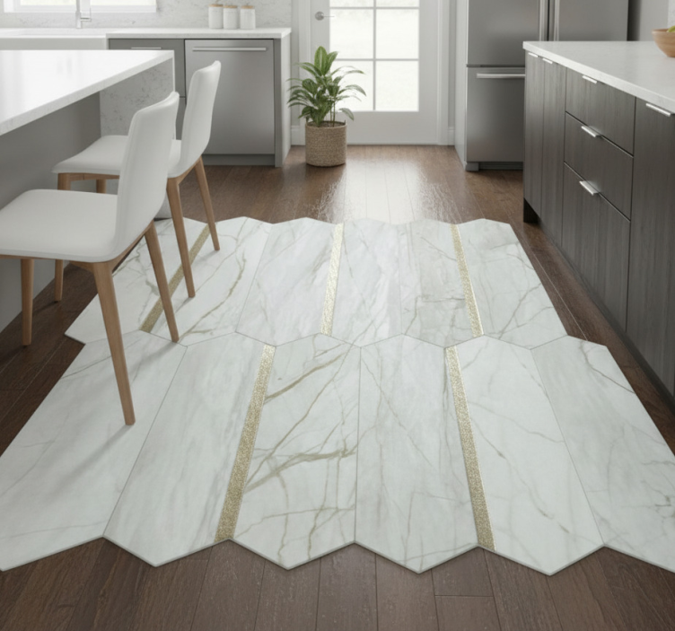 该设计采用几何图案,由延伸的六边形形状组成,呈现出淡雅的大理石色调。细腻的纹理在不同深浅的灰色和奶油色之间交织,营造出层次感,而细薄的金色条纹则交错于形状之间,为设计增添了一丝优雅,提升了整体视觉吸引力。