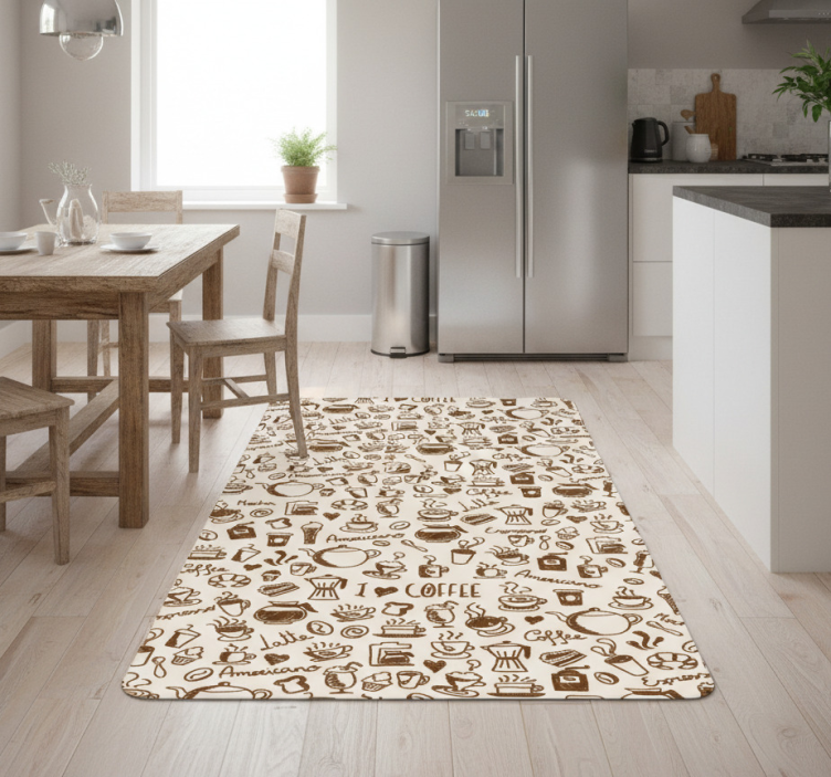 这款设计独特的乙烯基厨房地毯咖啡图案门用乙烯基,将咖啡色调与现代图案完美结合,赋予您的厨房一个温暖而时尚的氛围。其图案灵感来源于经典咖啡文化,带来视觉上的舒适感,同时具备防滑、耐刮擦及易于清洁的优点,确保您的厨房既美观又安全。