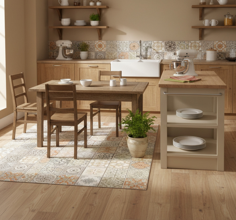 我们的乙烯基厨房地毯复古温暖拼贴以其独特的拼贴设计为您的厨房增添了一抹复古的魅力。这款地毯采用温暖的色调和精致的图案,使每一次烹饪都充满乐趣。其防滑特性确保在忙碌的厨房中安全行走,而耐刮擦的材质则为其提供了持久的使用寿命。无须安装,您只需铺设即可享受优雅的厨房环境。此外,绝热设计也让您的厨房更加舒适。