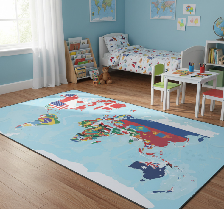 该设计展示了一幅色彩斑斓的世界地图,精细地描绘了代表不同地区的各国国旗。每个大洲都有独特的突出,展现了在蓝色背景下的生动国家象征。整体效果视觉上引人注目,旨在激发对地理和国际文化的兴趣。