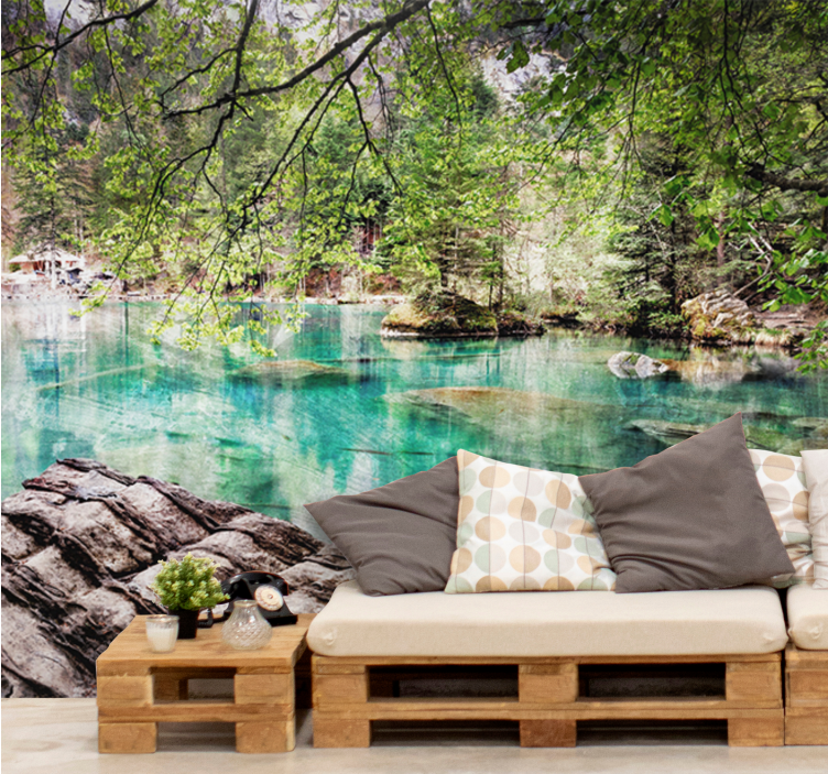 在这幅风景墙壁画宁静湖泊景致中,您将欣赏到湖泊与树木相映成趣的优美画面,仿佛置身于宁静的自然森林。画面中的水面波光粼粼,周围的岩石和树木相互辉映,形成了一幅生动的自然景观。无论是在家中还是办公室,这幅壁画都能为您带来一丝宁静与放松的氛围。