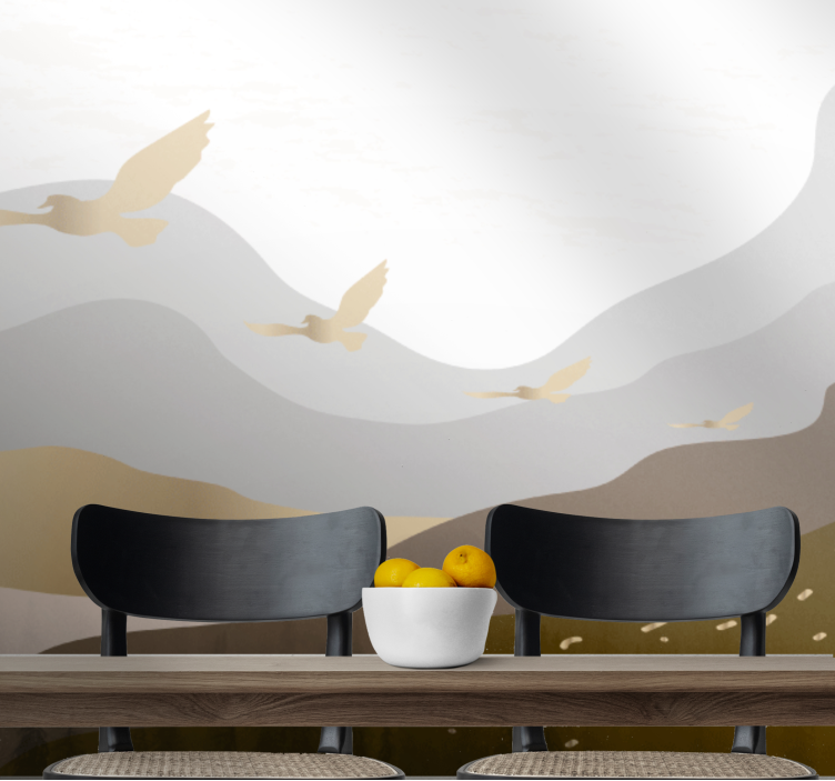 优雅的鸟类轮廓在起伏的丘陵和层叠的山脉上翱翔。设计完美地捕捉了自然的本质,突显出一个宁静的景观,采用简单的形状和自然的色调。和谐的布局营造出一种宁静的氛围,邀请人们与户外建立联系。