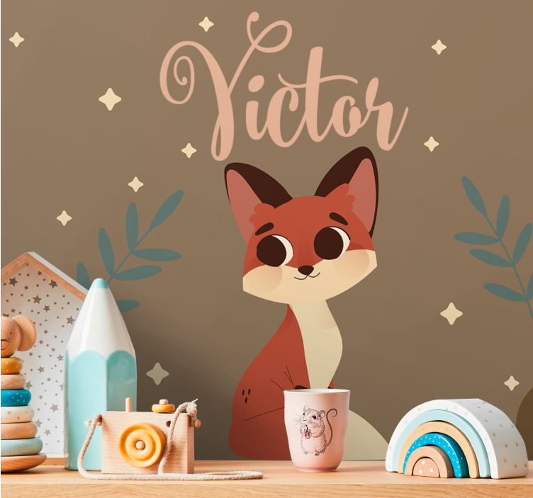 一个迷人的狐狸角色,拥有超大的眼睛和顽皮的性格,周围环绕着精致的叶子和星星。设计中融入了名称'Victor',为这个令人愉悦的图案增添了个性化的元素,非常适合儿童空间或游乐区域。