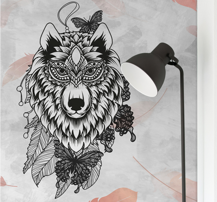 一个复杂的设计,中央是一只狼,装饰着华丽的图案。狼周围环绕着精致的蝴蝶和风格化的叶子,创造出迷人而艺术的野生动物表现。这件作品反映了自然与艺术的和谐融合。
