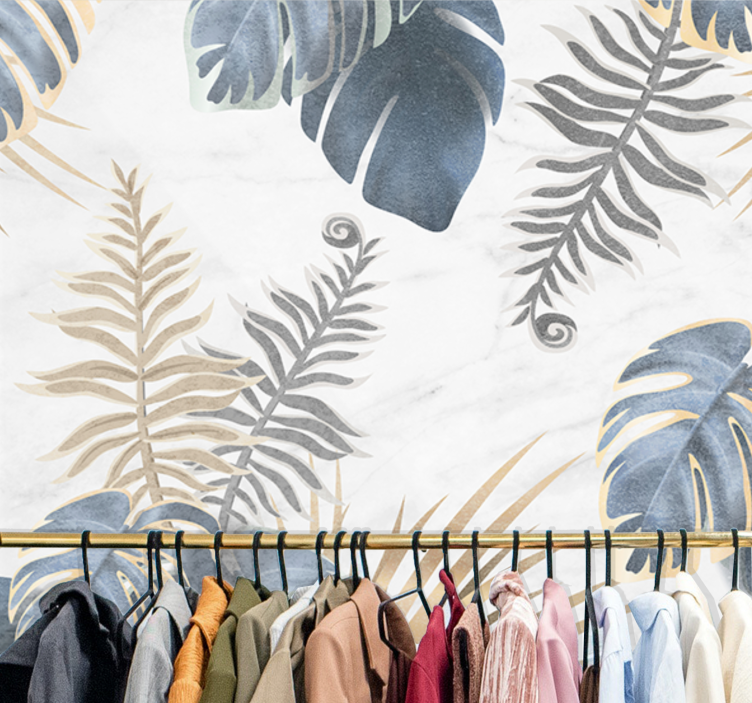 一个优雅的设计,展现了各种叶子和植物的色彩融合。复杂的排列捕捉了自然的本质,展示了热带叶子和蕨类植物的结合,营造出一种清新宁静的氛围。