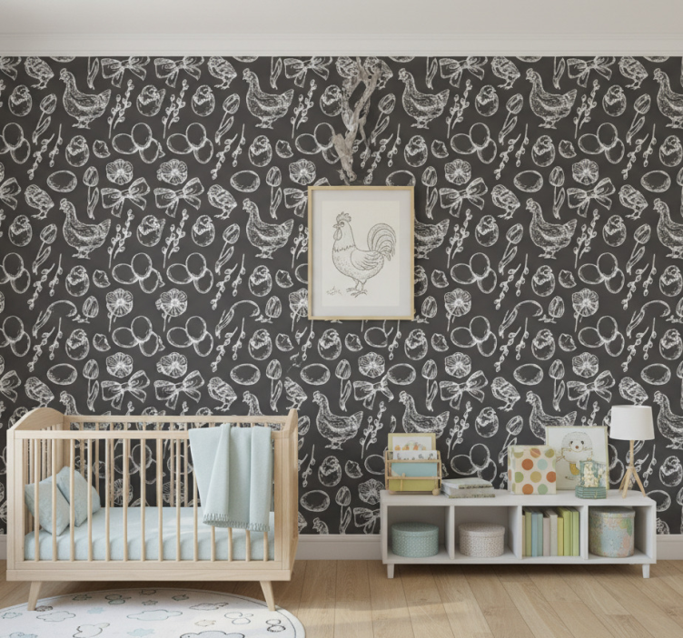 一幅令人愉悦的手绘鸡、蛋和花卉元素的组合捕捉了乡村生活的精髓。细腻的细节包括小鸡和优雅的蝴蝶结,营造出自然灵感图案与深色背景的和谐融合。这个设计唤起了温暖和怀旧,完美适合营造愉快的氛围。