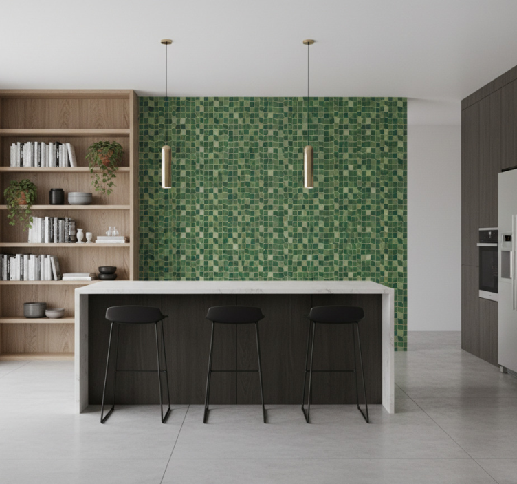 一个引人入胜的马赛克图案,采用各种绿色阴影,融合了几何形状。设计中包含复杂的细节,带有深绿色的点缀,唤起自然和清新的感觉。瓷砖的和谐排列创造了视觉节奏和宁静的氛围。