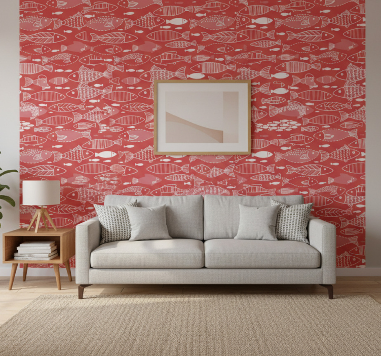 一个生动的设计,背景是丰富的珊瑚色,描绘了各种鱼类的醒目白色轮廓。排列展示了不同形状和大小的鱼,营造出活泼的水下主题。这个俏皮的图案与海洋美学相得益彰,增添了一丝魅力,邀请人们感受乐趣和探索的乐趣。