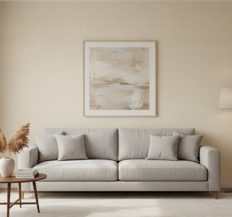 柔和的米色和细腻的蓝色在这幅艺术作品中营造出宁静的视觉体验。流畅的笔触唤起一种平静的感觉,令人想起遥远的地平线和宁静的水面。色彩的温和交织邀请人们反思,使其成为任何空间的理想焦点。