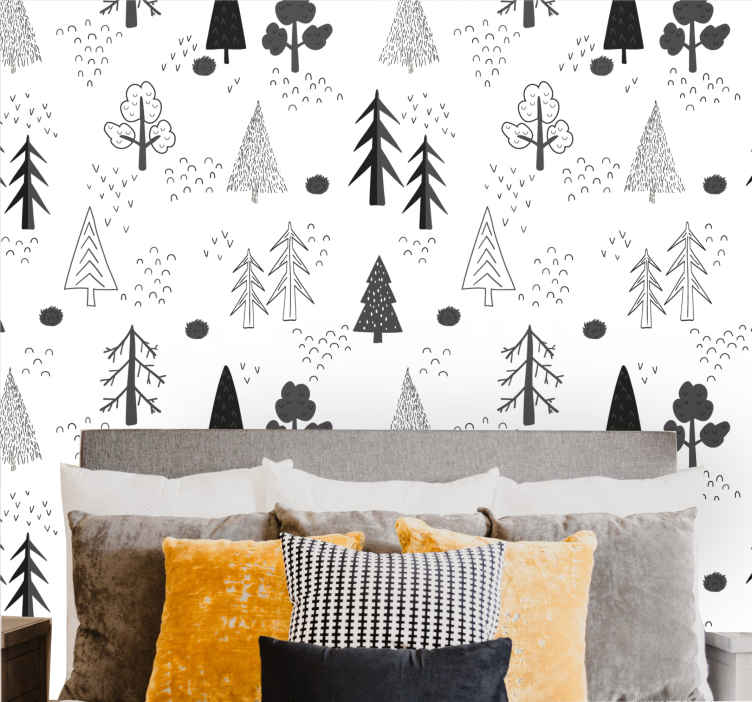 參考:: P8873这幅图展示了一个受斯堪的纳维亚风格启发的森林,其中有各种树木和自然元素,采用简洁的单色风格。这个图案给人一种清新和现代的感觉,适合寻求北欧风格的空间。