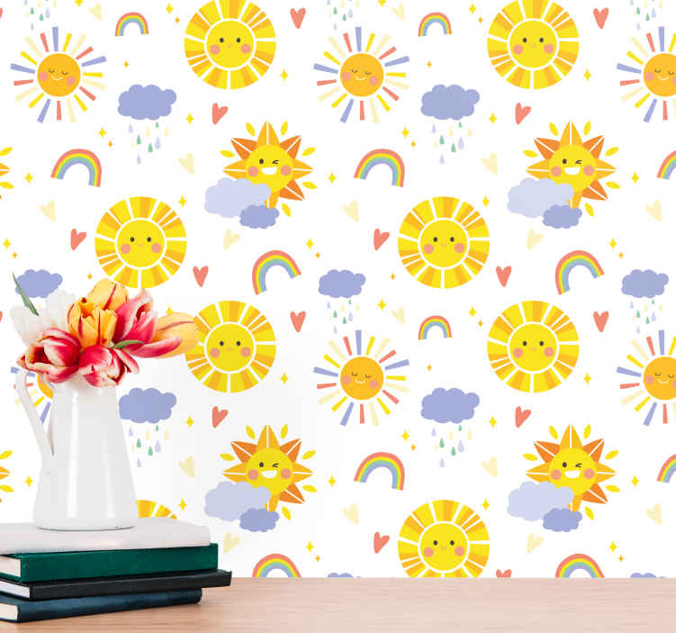 这款幼儿园墙纸散发着快乐和俏皮的氛围,设计灵感源自太阳、云、卡通片、彩虹和雨滴等元素。图案中充满了太阳的温暖和云朵的柔和,配以可爱的卡通图案,让人感受到阳光明媚的快乐氛围。