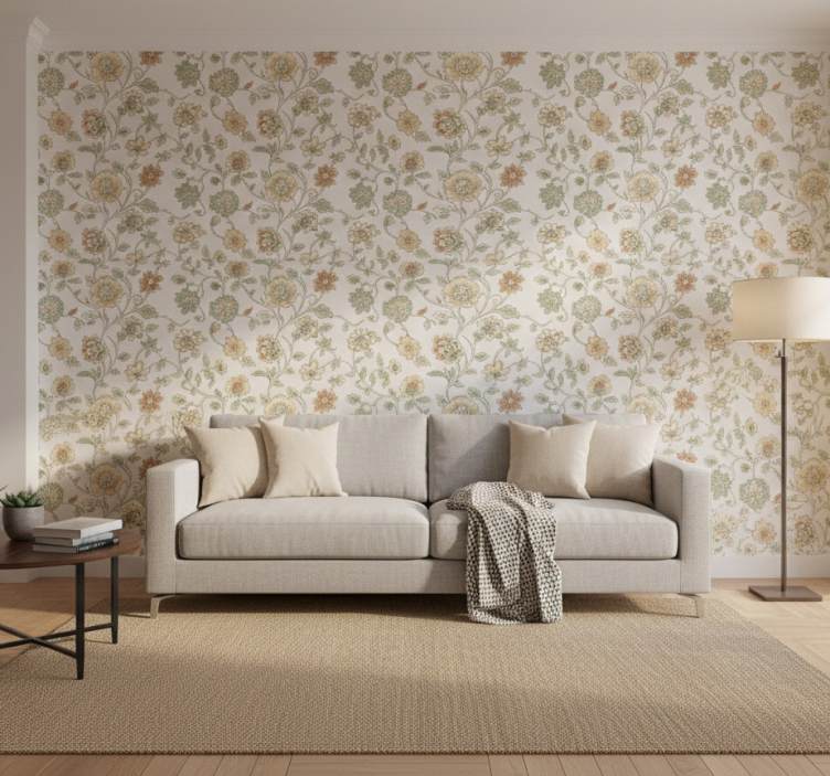 一个复杂的图案,展示了柔和的橙色、绿色和奶油色花朵。设计将生动的花朵与优雅的藤蔓交织在一起,营造出郁郁葱葱的植物氛围。每一个细节都增强了自然的美,形成一种和谐的视觉体验,令人感到宁静。