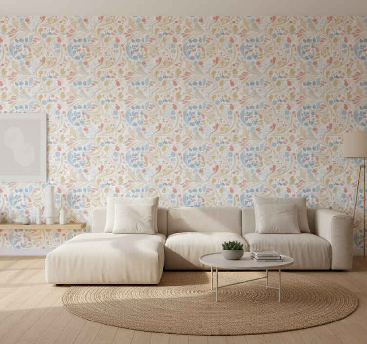 一个迷人的图案,展现出自然的旋转元素。淡雅的蓝色、粉色和金色交织在一起,伴随着精致的花朵和圆润的形状。这个设计散发着宁静和快乐,体现了一种充满活力却又舒缓的美学,和无忧无虑的精神相得益彰。